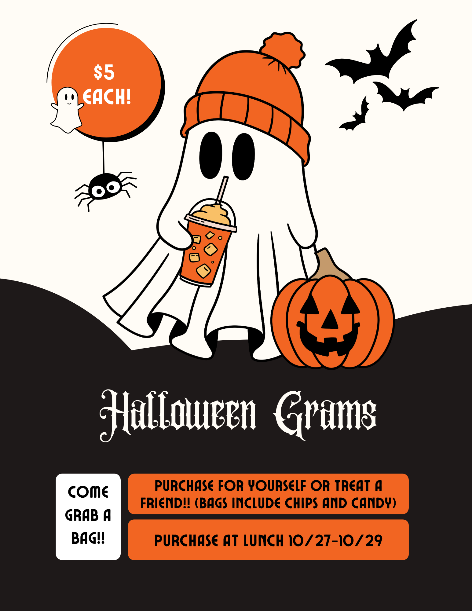 Halloween Grams Grab a Bag! Purchase for yourself or as a gift for a friend! (bags include chips and candy) Purchase at lunch 10/27-10/29
